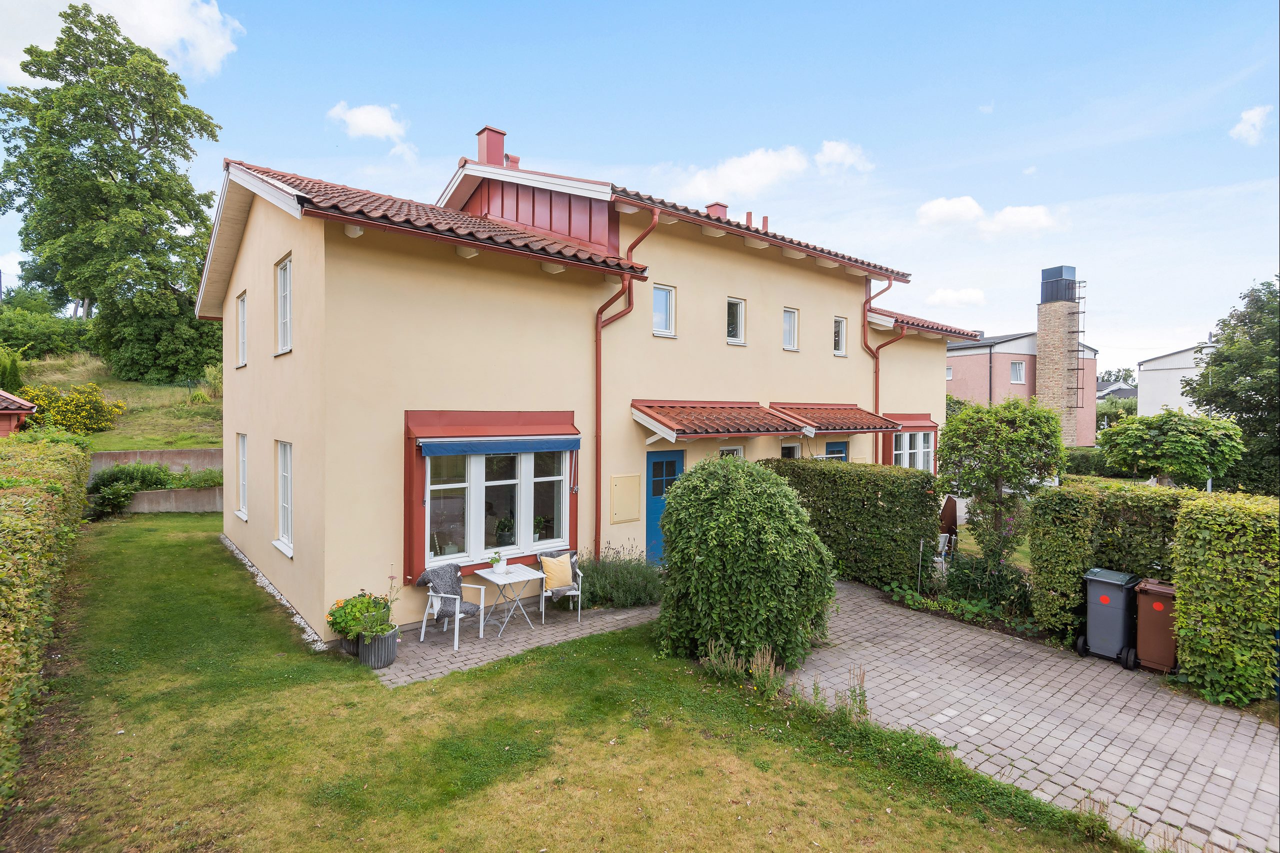 Parhuset omges av trivsamma utomhusytor med stenlagd matplats på baksidan samt gräsmatta och upphöjda rabatter. Baksidan ramas in av en mur och bakom den finns en kulle med en skogsglänta, vilket gör att uteplatsen upplevs som ostörd. Gavelläget bidrar mycket till avskildheten och villakänslan, med en insynsskyddande häck och plats för utemöbler/berså även på framsidan.