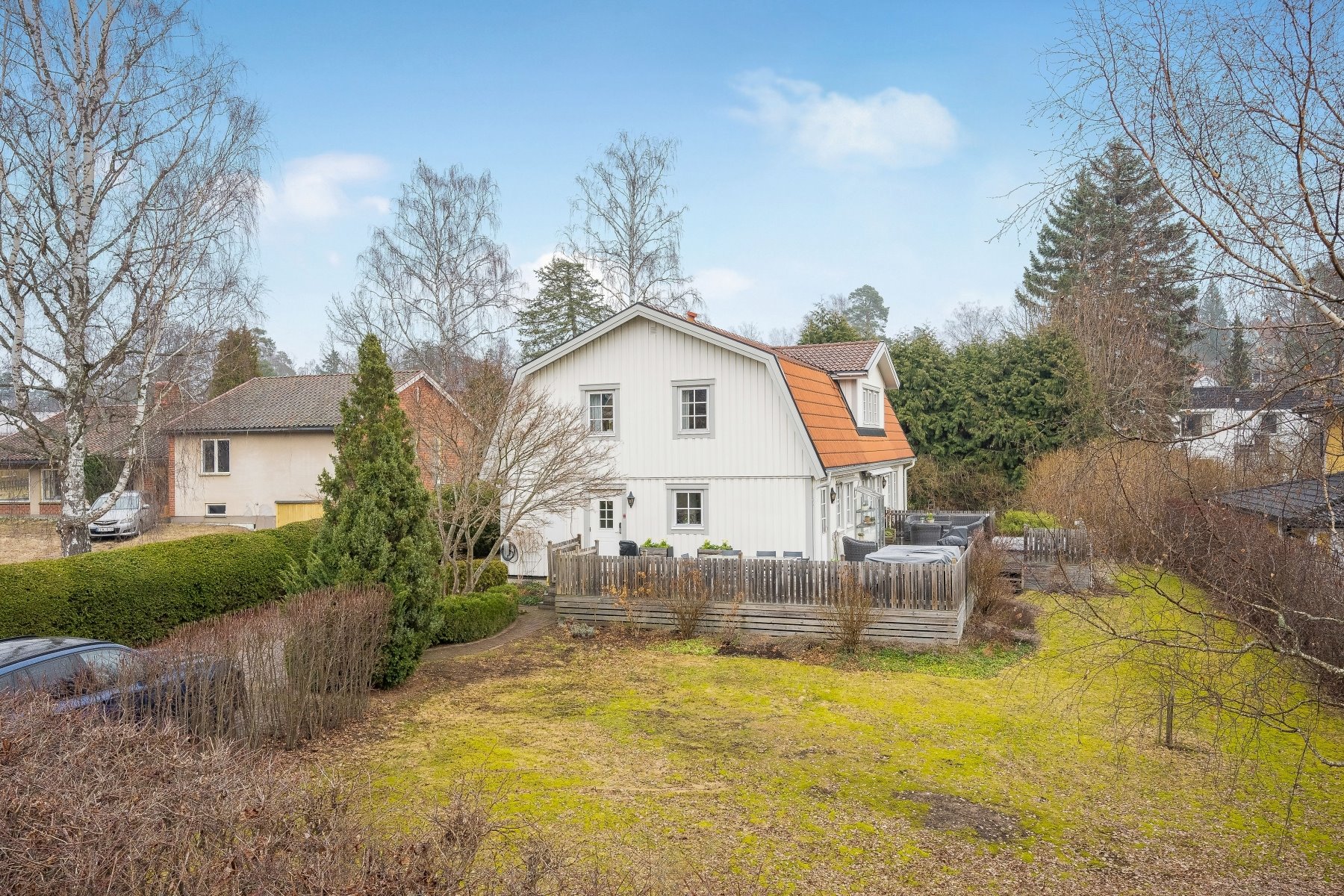 Tomten är plan och lekvänlig med mestadels gräsmatta på den södra baksidan, medan framsidan till större delen har stenläggning – praktiskt för cyklar och barnvagnar. Hela trädgården är bra skyddad av en häck vilket gör bostaden och uteplatsen relativt insynsfria.