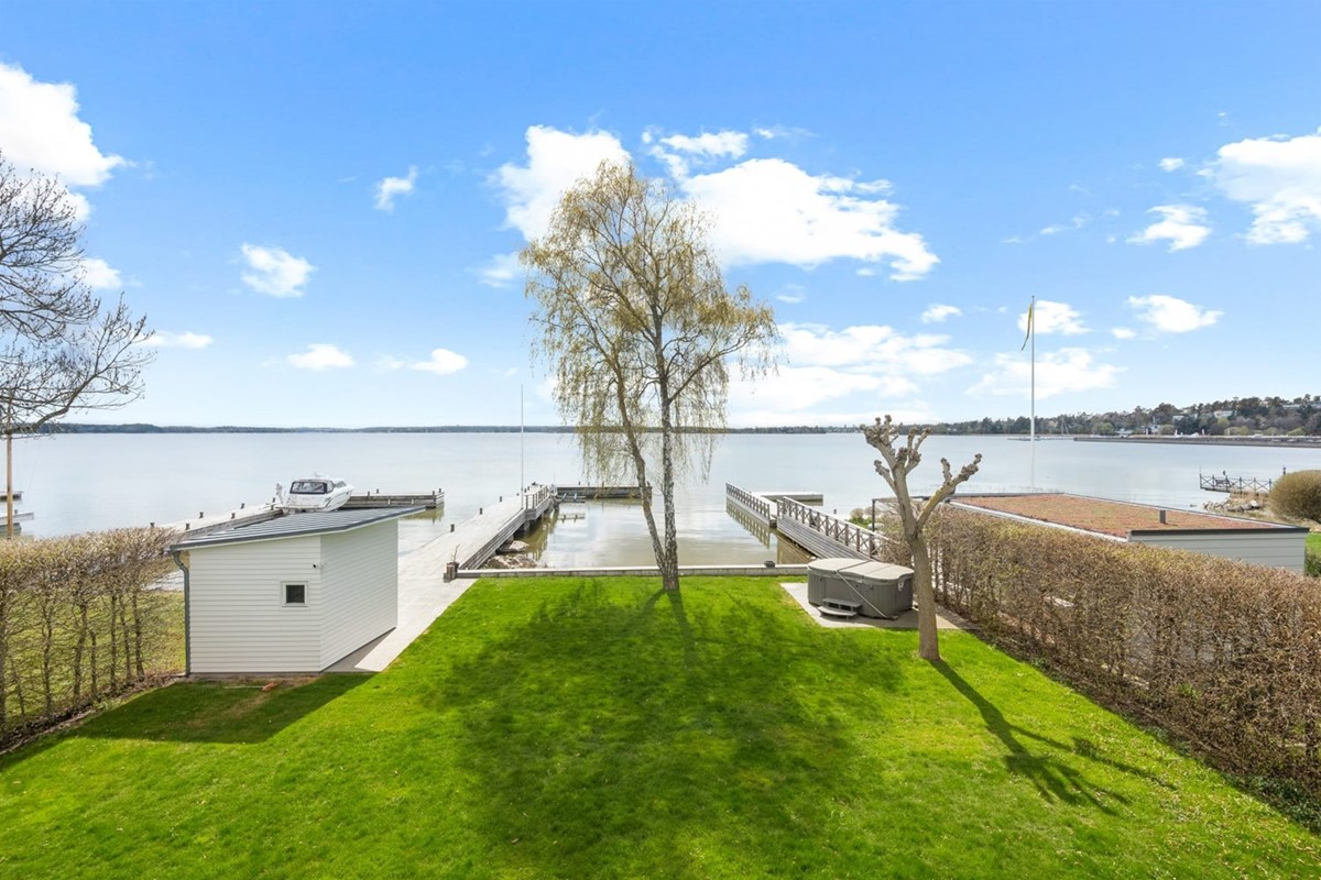 Mot söder sträcker sig trädgårdens gröna gräsmatta ner till vattnet och brygganläggningen med båtlift. Här finns även en fin sjöbod, möjlig att nyttja som gästhus, och egen strand med gjuten mur och trappavsats ner till vattnet. Dessutom finns en stenlagd yta för spabad. Till fastigheten hör ett uppvärmt dubbelgarage och framsidans fina stenläggning rymmer flera bilar.