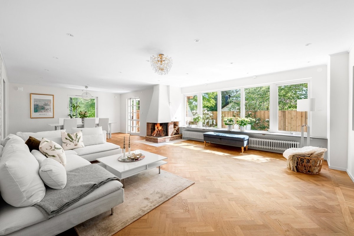 Till höger om hallen öppnar sig de härliga sällskapsytorna i ett mycket spatiöst vardagsrum med vacker parkett, vacker öppen spis och flödande ljusinsläpp från fönster längs hela framsidan. Den öppna planlösningen mot matsalen ger en social och trevlig miljö för både familjelivet och middagar där matsalen är ett inbjudande måltidsrum med plats för många personer. Här har du även utgång till framsidans altan i österläge – sommarens självklara frukostplats!