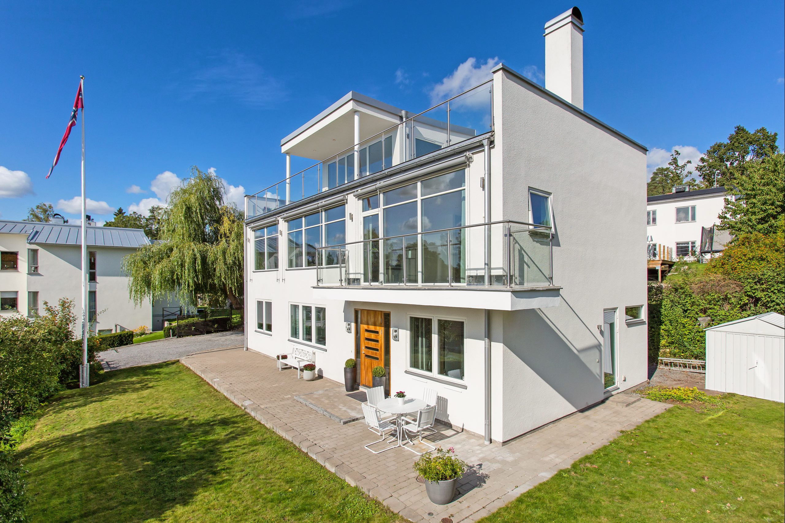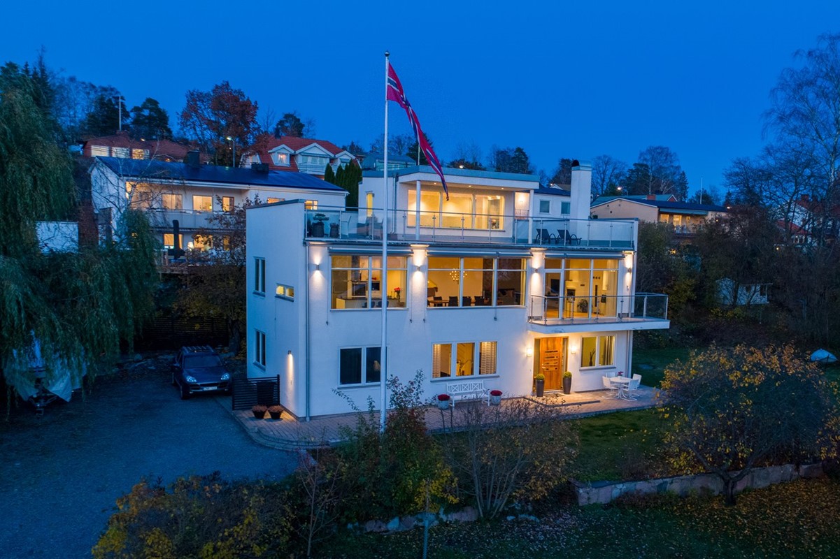 Med fantastiskt läge på Viggbyholms soliga sjösida ligger denna arkitektritade moderna villa med hänförande sjöutsikt över Värtan. Suverän planlösning med fem bra sovrum och generös sällskapsdel i öppen planlösning med det stilrena köket. Stora panoramafönster i söderläge ger ett underbart ljus och fri sjöutsikt. En helt magisk takterrass om ca 90 m² med vidsträckt sjöutsikt. Villan är gediget byggd i betong, med exklusiva materialval och smakfull design. Ett verkligt drömhem!