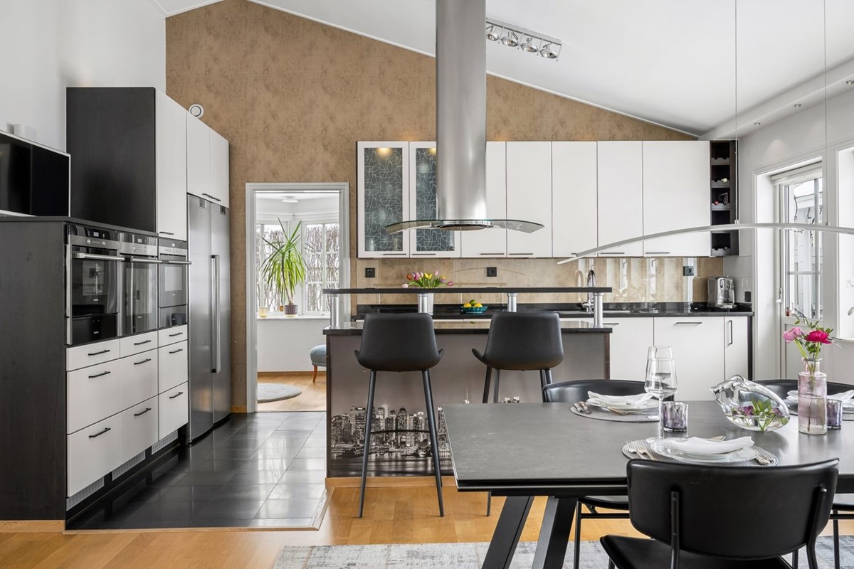 Vi möts av en takhöjd på över 4 m, stora fönster och därtill vackra bågfönster. Köket öppnar upp till en ljus och rymlig matplats med utrymme för det stora matsalsmöblemanget, med egen utgång till trädgården och till den insynsskyddade verandan. Här finns även en köksö med spishäll och bardisk med plats för barstolar. Svarta granitbänkskivor av finaste kvalitét, tre ugnar - vanlig, mikro samt ångugn med tallriksvärmare. Elegant smakfullt kök med dyra materialval och bra arbetsytor gör köket till en plats man vill tillbringa tid i.