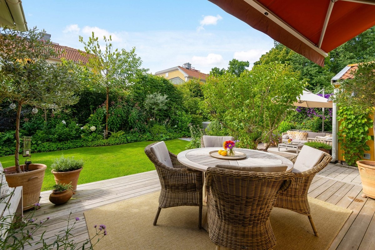 Bostaden är inte minst en dröm för den trädgårdsintresserade. Hörntomten gör huset mer privat och trädgården är både vacker, barnvänlig och lättskött med fantastiskt vackra planteringar och flera olika ”rum”. Här samsas plana lekvänliga gräsytor med omsorgsfullt anlagda perennrabatter som blommar från tidig vår till sen höst, allt inramat av en vintergrön ligusterhäck.