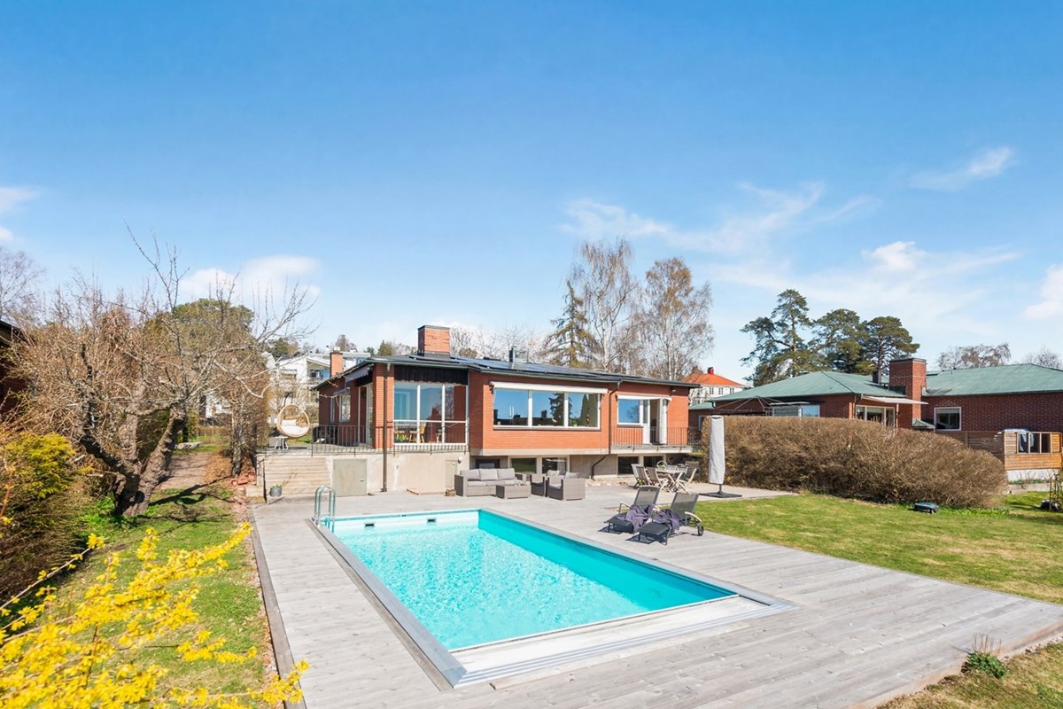 Pooldäck och uteplatser gör huset fantastiskt sommartid, men sjöutsikten och läget gör det även till en bostad som man älskar att komma hem till året runt, med skärgårdens lugn kombinerat med en bekväm vardag där allt finns nära – förskolor och skolor, strandpromenad och badplatser. Till vattnet är det knappt 100 meter och till närmaste busshållplats mindre än 200 meter.