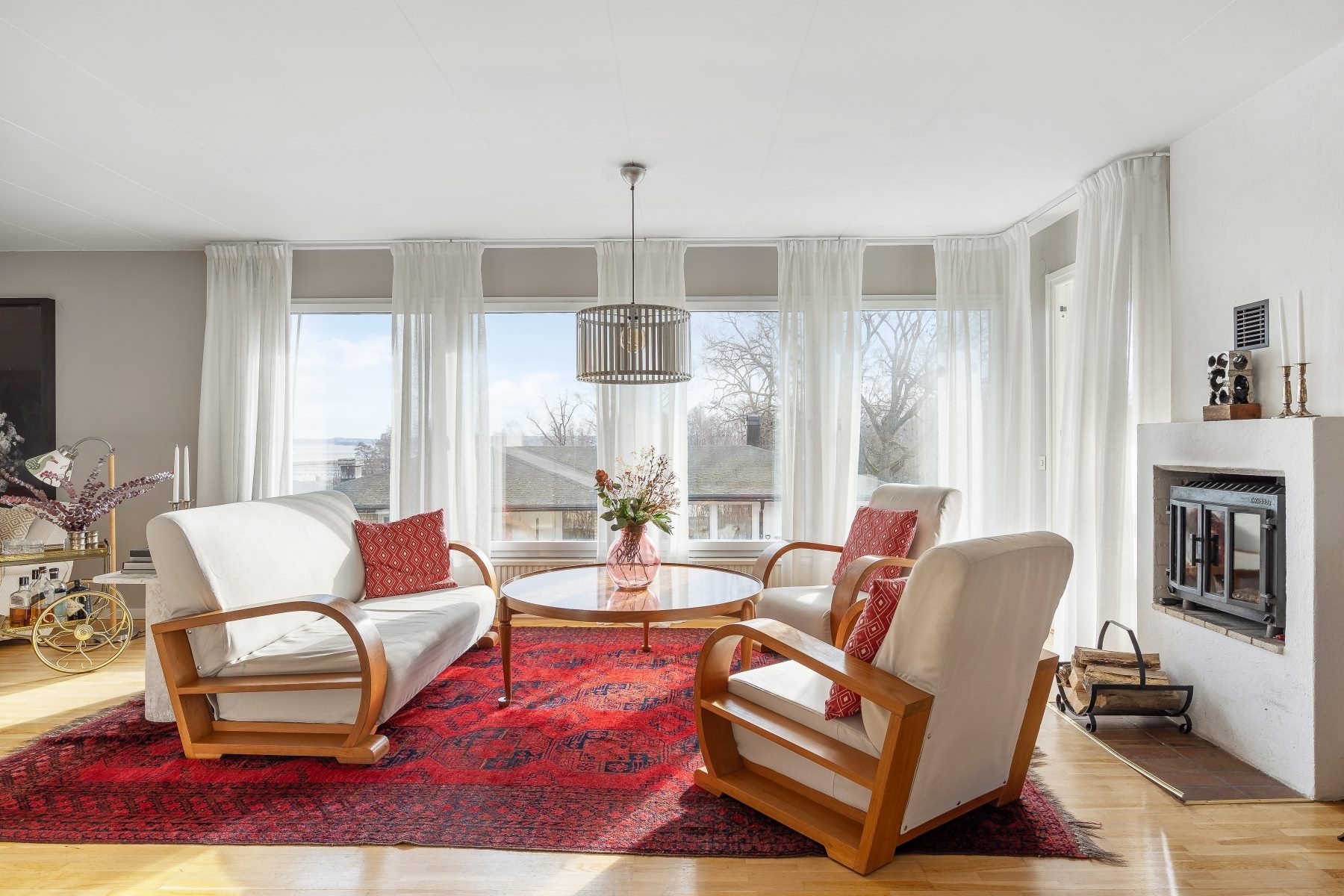 Hallen öppnar upp till en passage med trapphus, och till höger når du den första delen av vardagsrummet – perfekt som alternativ matsalsdel nära köket. Vardagsrummet fortsätter sedan i en långsträckt och mycket spatiös sällskapsdel med fönster som ger panoramautsikt över omgivningarna och Värtan. En inbyggd eldstad på kortsidan mot köket förstärker mysfaktorn.