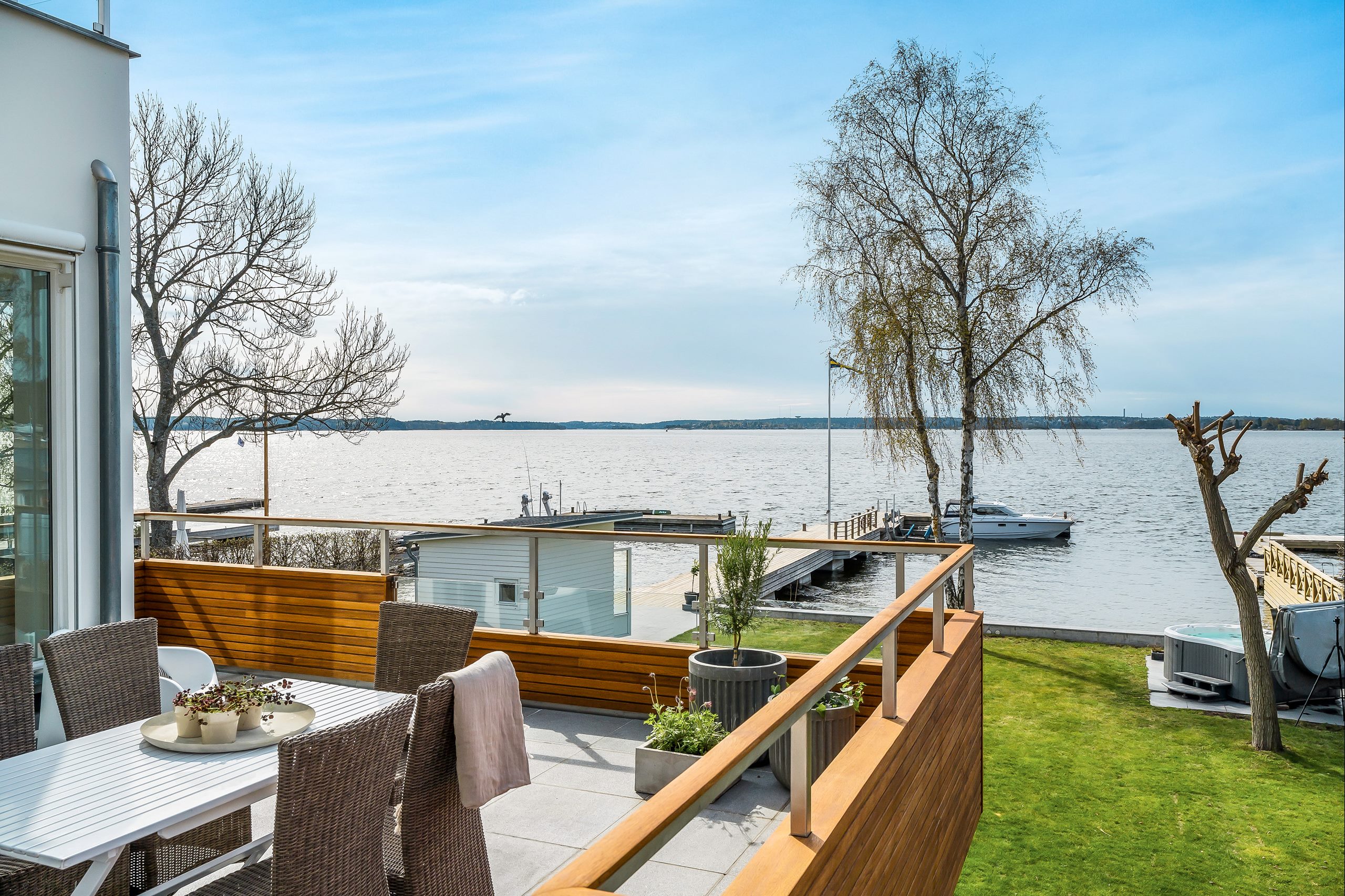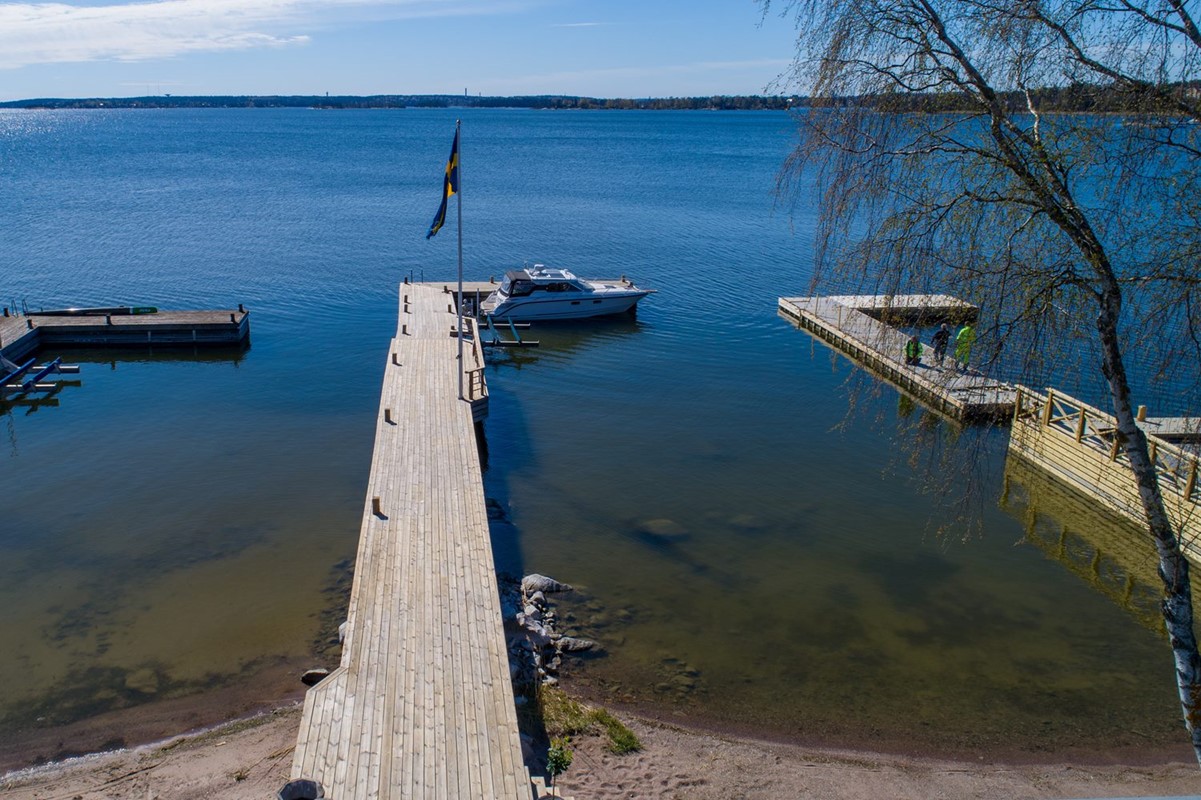 Utan tvekan en av de bästa strandtomterna med söderläge och makalös sjöutsikt över Stora Värtan. Totalyta 354 m². Modern, mycket påkostad fastighet i internationell stil. Gediget byggd funkisvilla i sten och platsgjuten betong med vackra materialval. Ritad av arkitekt Jonas Waldemarson. Stor egen brygganläggning med båtlift. Fin sjöbod. Gjuten mur vid strandkanten med trappavsats och sandstrand. Underbart soliga altaner, terrasser och uteplatser med fantastisk utsikt. Mycket representativ villa med generösa sällskapsytor. Uppvärmt dubbelgarage. Detta är en unik och underbar fastighet för dig som ställer mycket höga krav på estetik, teknisk prestanda och komfort. Sammantaget ett verkligt drömboende som har allt man kan önska.