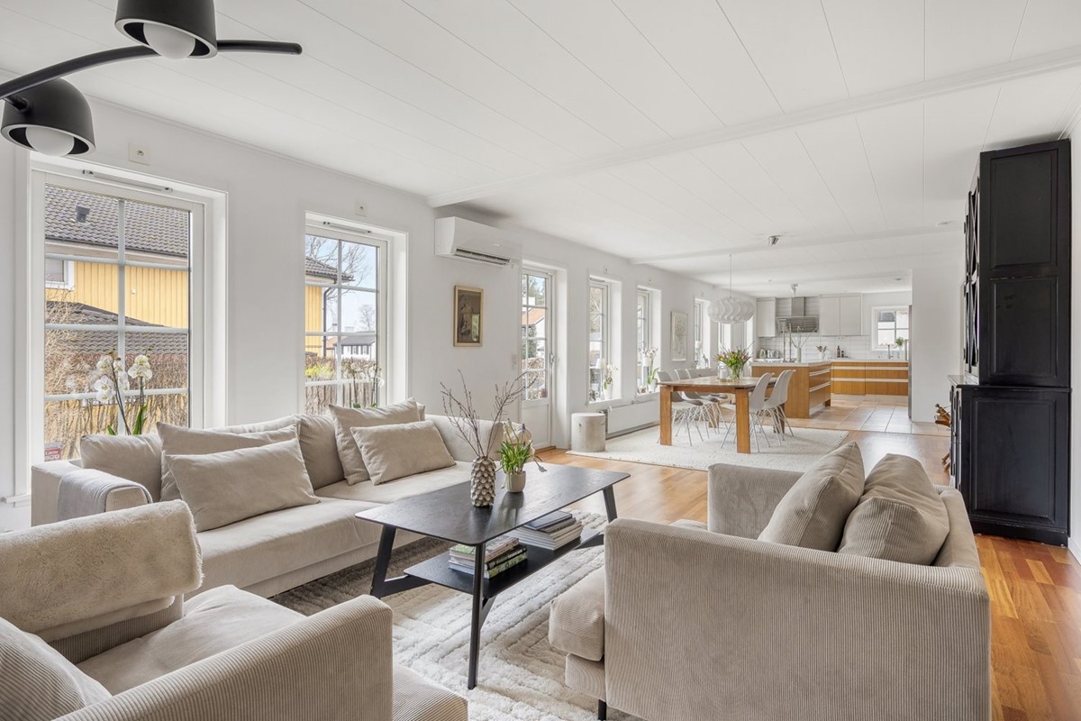 I synnerhet vardagsrummet har ett sagolikt ljusinsläpp och alla rum har ordentlig storlek – även utrymmen som hall och tvättstuga. Interiören är stilren och väl underhållen. Kök och vardagsrum har varsin utgång till den vidsträckta verandan, och tvättstugan har groventré till gavelsidans veranda.