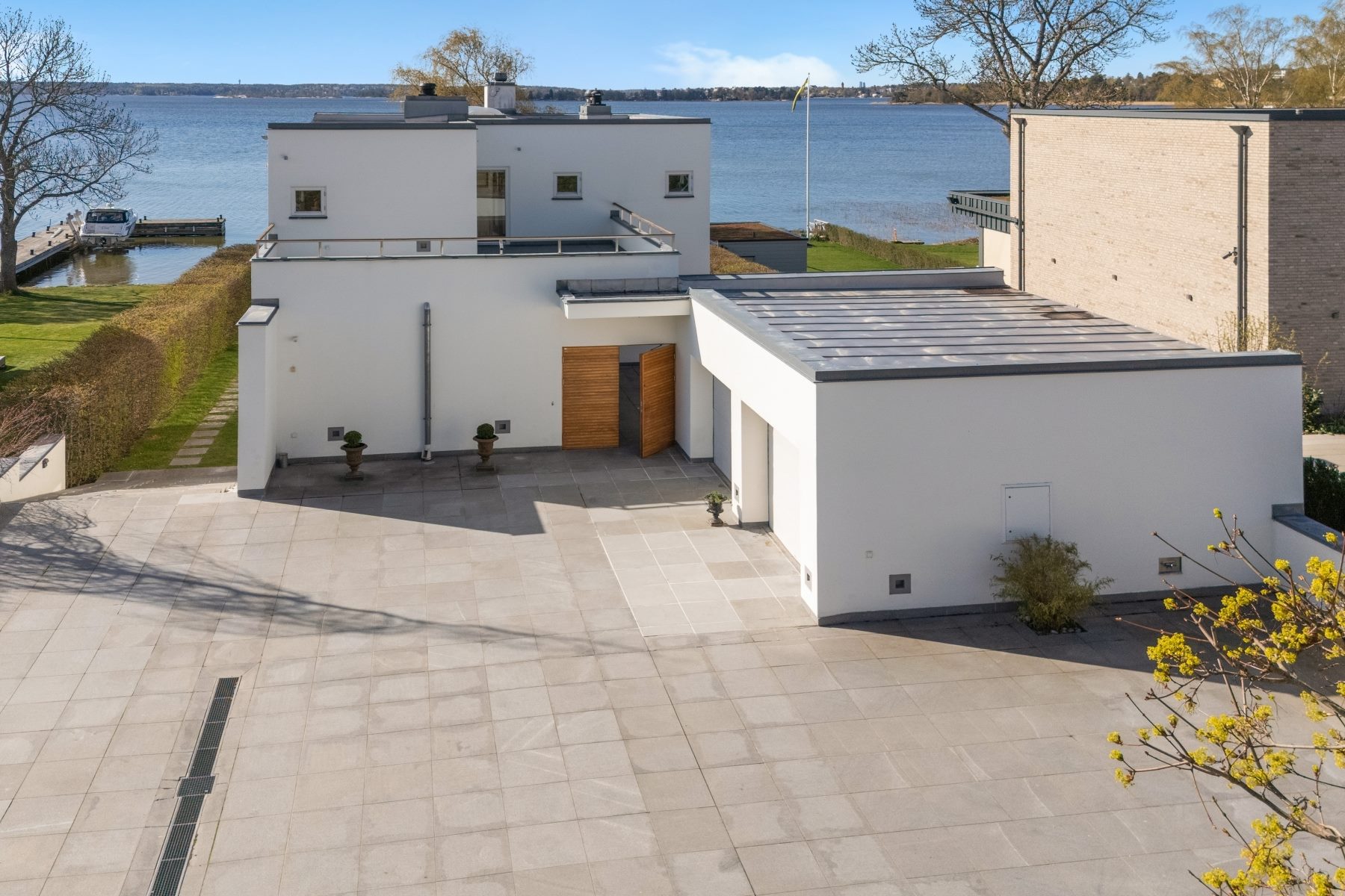 Mot söder sträcker sig trädgårdens gröna gräsmatta ner till vattnet och brygganläggningen med båtlift. Här finns även en fin sjöbod, möjlig att nyttja som gästhus, och egen strand med gjuten mur och trappavsats ner till vattnet. Dessutom finns en stenlagd yta för spabad. Till fastigheten hör ett uppvärmt dubbelgarage och framsidans fina stenläggning rymmer flera bilar.